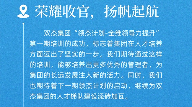 領(lǐng)杰計(jì)劃-全維領(lǐng)導(dǎo)力提升培訓(xùn)項(xiàng)目第一期圓滿收官! 5018 字號(hào) 返回列表 上一篇 2024.09.20 教師節(jié)??? 下一篇 雙杰集團(tuán)育杰計(jì)劃